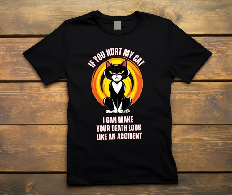 Protective, fierce, and funny—just like you. This bold tee says what every cat parent secretly thinks: "If you hurt my cat, I can make your death look like an accident." Featuring a moody, badass black cat and a fiery backdrop, this shirt isn't just apparel—it’s a declaration of feline loyalty with attitude.